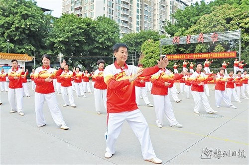 本报讯 (记者叶子通)5月1日上午,梅州市太极拳协会在梅江区群艺馆广场举行庆祝“五一”暨世界太极拳健身月志愿服务进社区活动。100多位中老年朋友,身穿统一服装,热情地展示了健身气功八段锦、太极拳、剑、扇、柔力球、健身球操、广场舞等群众喜闻乐见的健身节目。