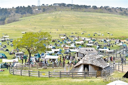 图为5月1日,游客在辽宁省大连市三寰牧场景区搭帐篷露营。 (新华社发)
