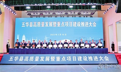 今年2月,继全省高质量发展大会、全市高质量发展暨苏区融湾先行区建设动员大会召开后,五华马不停蹄召开全县高质量发展暨重点项目建设推进大会。16个镇、16个县直单位“一把手”以及企业家代表纷纷上台作大会发言,围绕年度重点工作任务、重点项目推进、为民办实事项目等内容,依照目标进行细化分解,公开亮诺。