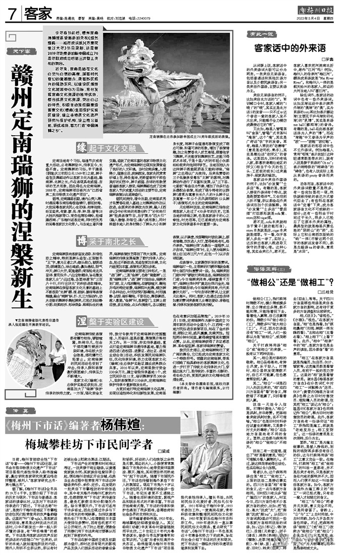 又比如,梅县人管喝茶叫“食茶”,管喝广式早茶叫“淹茶”,这个“淹”,其实是广府话“饮”字的发音。再有,梅县人常说的“老赛啤”(意思是老司机、熟手),其实是潮汕话“老师父”的音译。这是因为,旧时的有钱人家,都喜欢请潮汕地区的师父(相当于今天的包工头、工匠班的班长)过来盖房子、做家具的缘故。