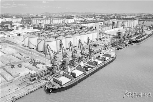 5月4日,从南非进口的首船饲料玉米靠泊广东麻涌港(无人机照片)。