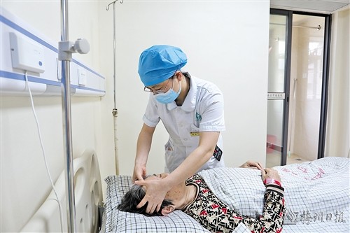 “阿婆,我现在帮您按摩一下穴位,能缓解您的头痛,您先感受一下力度,力度可以吗?有不舒服就跟我说啊。”在梅县区中医医院内二科的病房里,这样的温情时刻几乎每天都在上演,护士长刘单用真诚的关怀竭力给每个病人送去温暖,鼓励他们勇敢战胜疾病。