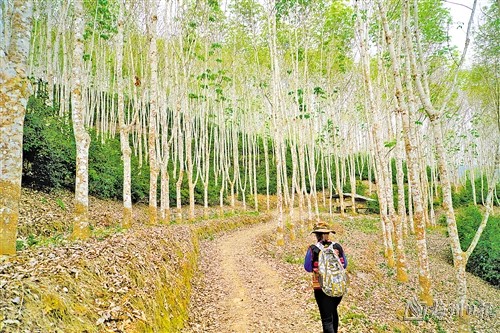 穿着少数民族服装的向导带领我们走在1米多宽、缓缓而上的泥土路上,边走边介绍路边的芭蕉、柚子、砂仁、木瓜、百香果、苦子果、珍珠果、无花果、番石榴等种类繁多的热带作物,让我们增长见识。而最吸引我们眼球的是那漫山遍野的橡胶树和茶园,路旁、山坡上那一排排、一行行、一片片整齐排列、修长笔直的橡胶树,犹如受过严格训练、意志坚强的战士,虽因久旱缺水而疲惫不堪,却没有一个脱离队伍或弯下腰来,个个都强振精神,昂首挺立,坚守着这片神奇的土地,欢迎我们这些远方的朋友。