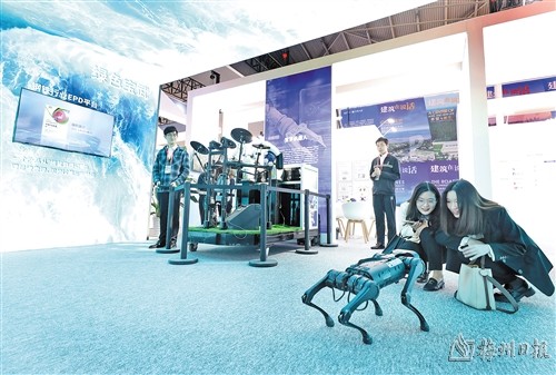 5月10日,参观者在中国宝武展台上与一个四足机器人互动。