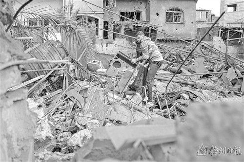 5月11日,在加沙地带拜特拉希亚,一名男子检查空袭后的自家房屋废墟。