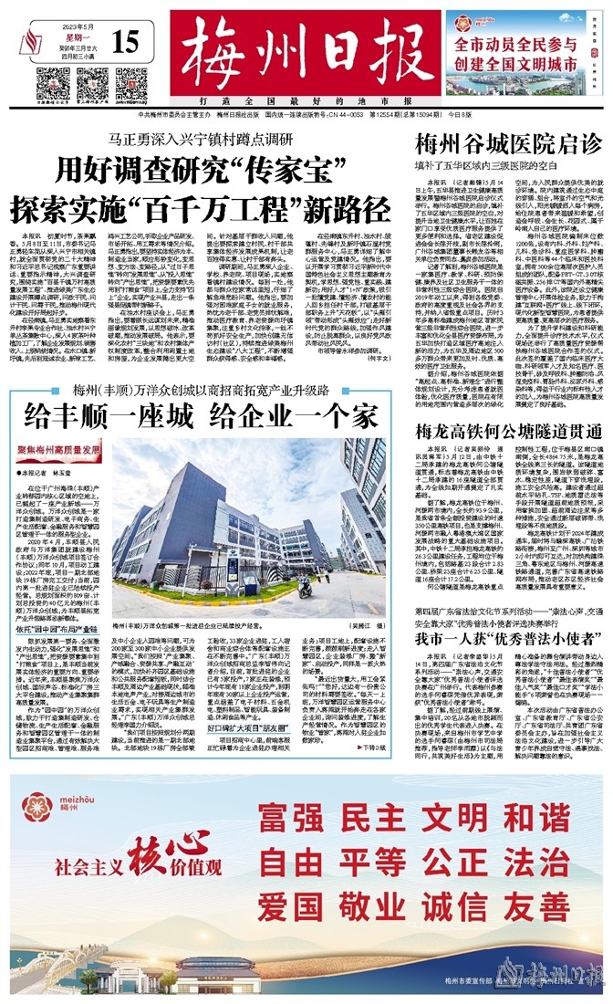 2020年4月,丰顺县人民政府与万洋集团就建设梅州(丰顺)万洋众创城项目签订合作协议;同年10月,项目动工建设;2022年底,项目一期北部地块19栋厂房完工交付;当前,园内第一批进驻企业已陆续投产经营。总规划面积约809亩、计划总投资约40亿元的梅州(丰顺)万洋众创城,为丰顺县拓宽产业升级路再添新载体。