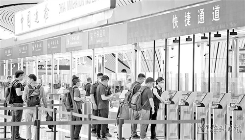 图为5月15日,旅客准备通过北京大兴机场边检站快捷通道。