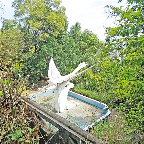 我们沿着阶梯走下去,站在平地的边缘,只见一个类似水池的建筑物中央,一个富有艺术感的弧形台基上蹲着一个正欲展翅高飞的巨大白天鹅。这只天鹅雄赳赳地昂起头,展开它硕大有力的翅膀,凝视着远方的目标,仿佛是即将离弦的箭,又似是等待比赛号令的运动员。