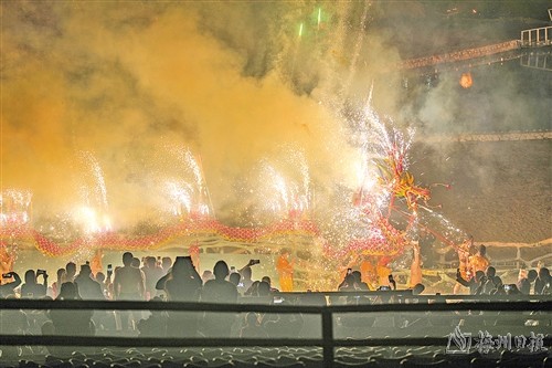 国家级非遗埔寨火龙、打铁花,旋转火龙、焰火、烟花、火把、火山、全息火龙……在丰顺县大宝山温泉旅游度假区的“火龙剧场”里,大型6D视觉民俗山水实景演艺剧目《千年火龙》为现场观众献上一场光与火的盛宴,赢得游客欢呼喝彩,纷纷举起手机定格精彩瞬间。
