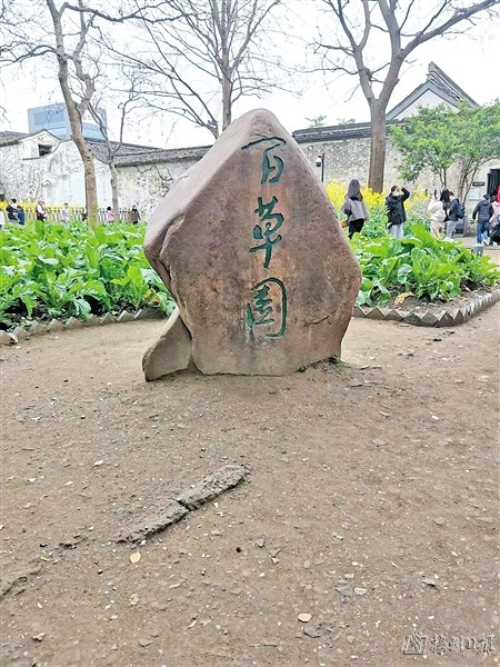 百草园在故居的后面。当我们从圆形的孔门进来时,映入眼帘的是一个占地约2000平方米的大菜园子。这个菜园,为当年周氏族人共有。当时园内种有桑树、皂荚树、覆盆子等,砌有矮墙,打有水井,是鲁迅童年时代的乐园,他常来这玩耍嬉戏,品尝紫红的桑椹和酸甜的覆盆子,在矮矮的泥墙根一带捉蟋蟀、拔何首乌。现在那高大的皂荚树还在,整个园子种上了青菜。油菜花开得正盛,很多游客在刻有“百草园”三个大字的大石头旁照相留念。百草园的尽头有一座小门,门两侧有一副对联:仰视桑椹熟,俯听蟋蟀鸣。鲁迅十二岁时,告别了这个乐园,到三味书屋求学。后来鲁迅祖父周福清科场舞弊案发,鲁迅的父亲被革去秀才身份,此后一蹶不振,病魔缠身,年仅36岁就去世了。从此鲁迅家也就从小康人家而堕入困顿。1918年经族人共议,将这个百草园连同周家新台门卖给了东邻朱姓。