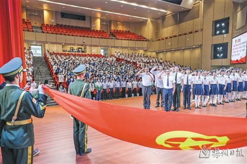 “五星红旗迎风飘扬,胜利歌声多么响亮……”伴随激昂的旋律,梅州市外语实验学校护旗队托举着五星红旗,昂首挺胸,迈着整齐有力的正步向升旗台行进。当国歌声响起,香港教育者联会黄楚标中学师生与梅州市外语实验学校师生整装肃立,目光紧随国旗,并高唱国歌。随后,两校师生一同重温入团宣誓(如上图,吴腾江摄),欣赏精彩文艺汇演,举行足球联谊赛,在多元而又仪式感满满的活动中,两地师生增进了彼此的了解,缔结了友谊。