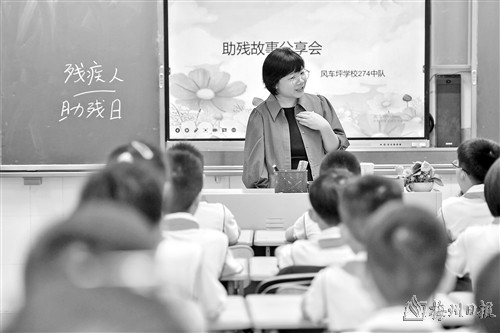 图为在湘潭市雨湖区风车坪学校,扶婷向五年级学生分享她的助残故事(5月19日摄)。