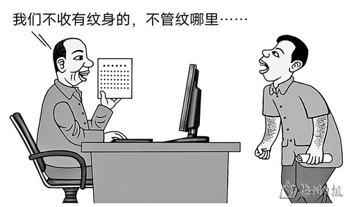 近日,东莞。一小伙有意进厂打工,可因为有纹身被拒。工厂负责人告诉他,“你的纹身可能就断送了你的前程。如果你想好好工作,我建议你去把纹身洗掉;我们工厂是不收纹身的,这是规矩。就是你做事做得再好我都不收的。”有网友表示,身体发肤受之父母不敢毁伤,正常人谁去纹身?也有网友说,纹身的不代表是坏人,但是好人一般不纹身。 王少华/图