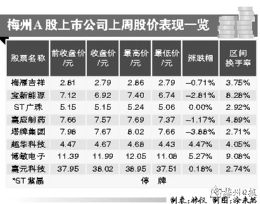 梅州9家A股上市公司上周股价3家上涨,4家下跌,1家平盘,1家停牌。