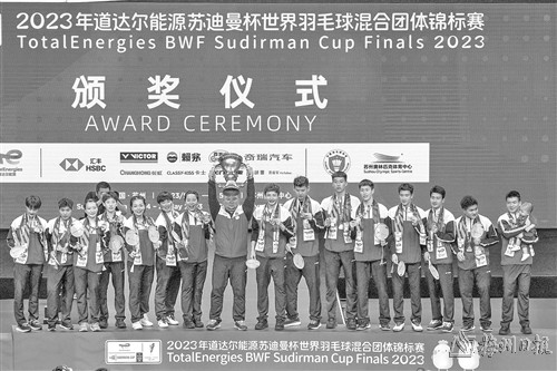 21日,中国羽毛球队在2023年苏迪曼杯世界羽毛球混合团体锦标赛决赛中以总比分3∶0战胜韩国队夺冠,实现三连冠,在总共18届苏杯中第13次登顶。
