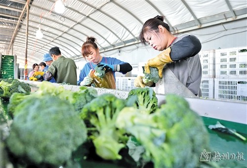近日,河北省滦州市小马庄镇一家蔬菜种植合作社的社员在分拣收获的西兰花。