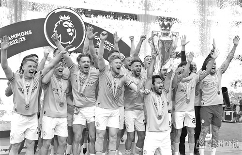 5月21日,在2022-2023赛季英格兰足球超级联赛曼彻斯特城队主场对阵切尔西队的比赛后,曼城队举行仪式庆祝夺得本赛季联赛冠军。在5月20日进行的英超联赛中,阿森纳队客场以0比1不敌诺丁汉森林队,意味着曼城提前三轮夺冠,实现英超三连冠。