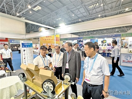 梅州二十八家企业展出超千件产品。图为丰顺县泰雅达实业有限公司展品吸引嘉宾和客商参观。(吴燕妮 摄)