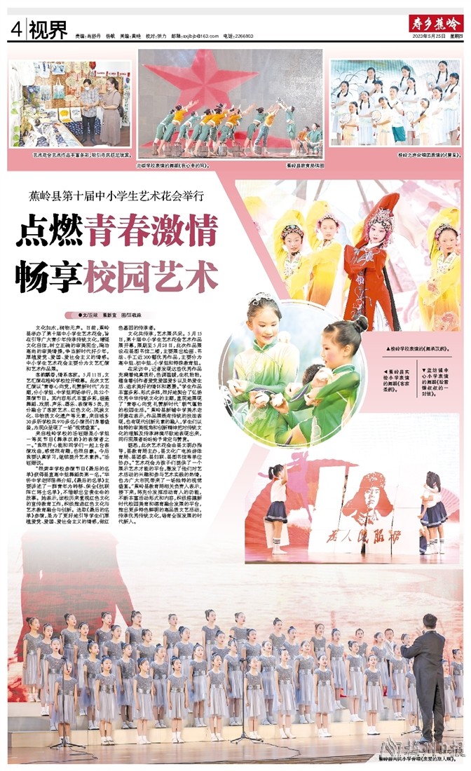 文化如水,润物无声。日前,蕉岭县举办了第十届中小学生艺术花会,旨在引导广大青少年传承传统文化,增强文化自信,树立正确的审美观念,陶冶高尚的审美情操,争当新时代好少年,厚植爱党、爱国、爱社会主义的情感。中小学生艺术花会主要分为文艺汇演和艺术作品展。