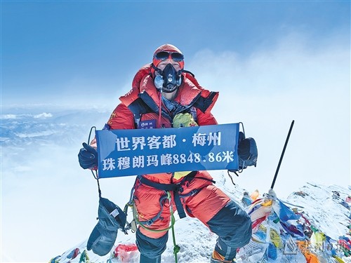 直到5月22日中午,记者收到了林志勇发来的消息,他完成了自己的个人梦想,也将“世界客都·梅州”的旗帜,带到了地表上离天空最近的地方。