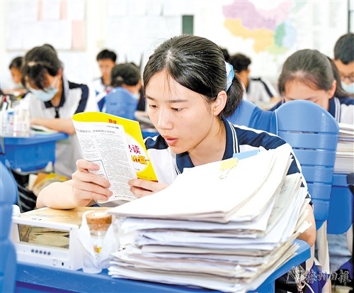 这几天,平远中学校园里“迎考”氛围愈发浓郁。清晨7时许,步履匆匆的高三年级学子陆续踏进教室。记者看到,一沓沓复习资料整齐堆放在走廊里,墙面上张贴着作文范文、时事热点、常用解题技巧等。教室里,学生们伏案自习,专心致志。他们有的在课桌上张贴了手写的励志卡片,有的则通过手表、时钟时刻提醒自己要争分夺秒,勇战夺魁。