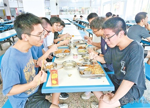 傍晚5时45分,是高三学生的休息和吃饭时间。走进人声鼎沸的食堂,有不少围聚一桌的高三学子,他们聊梦想,互相打气,其乐融融。也有学生在简餐过后,早早回到教室做题。学生小姚笑着说:“我一般在晚自习打铃前,提早半小时回到教室,争分夺秒多看点书。”