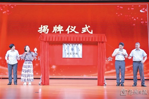 随后,伴随着喜庆的音乐,校长谢仁发、党支部书记兼常务副校长陶伟、驻校理事陈惠勤、学校家长委员会主任闫维丽一同为家长学校进行揭牌。