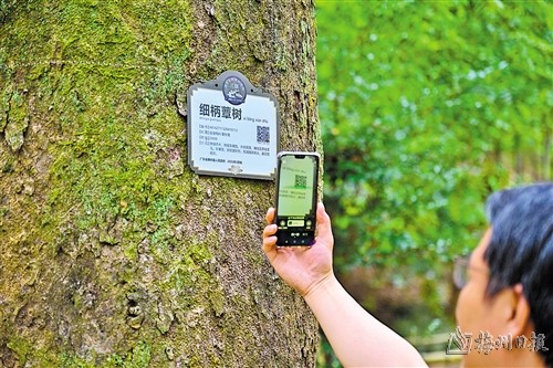 “这是细柄蕈树,树龄已达240年。你扫一下树上挂着的保护牌二维码,就能全面了解它的‘身份信息’。”颜丽君介绍说,古树被誉为“绿色的活文物”。近年来,蕉岭县依托林长制,多措并举加强对古树名木的保护管理,有序开展古树名木普查建档和复壮修复工作,并按照“一树一策”全面落实保护责任,实施动态管理,为古树名木撑起“保护伞”。目前,全县411株古树名木已全部建档立卡,实现“一树一档”。