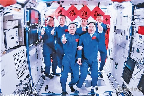 据中国载人航天工程办公室消息,在载人飞船与空间站组合体成功实现自主快速交会对接后,神舟十六号航天员乘组从飞船返回舱进入轨道舱。5月30日18时22分,翘盼已久的神舟十五号航天员乘组顺利打开“家门”,欢迎远道而来的神舟十六号航天员乘组入驻“天宫”。随后,两个航天员乘组拍下“全家福”,共同向牵挂他们的全国人民报平安。