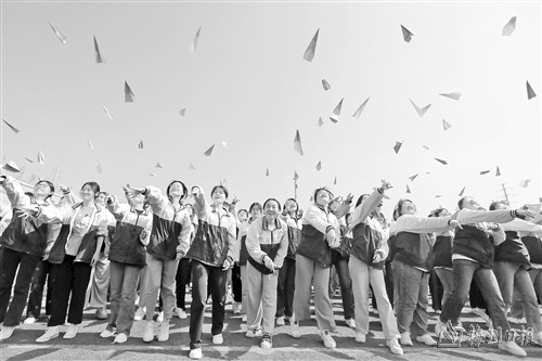 5月31日,在淮北市第十二中学,高三学生在操场上扔纸飞机。
