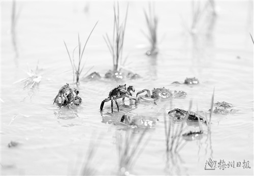 5月31日,在河北省唐山市丰南区夏新庄村的稻田拍摄的螃蟹苗。