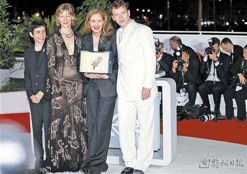 图为法国导演朱斯蒂娜·特里耶(右二)与主要演员展示“金棕榈奖”奖杯。(新华社)