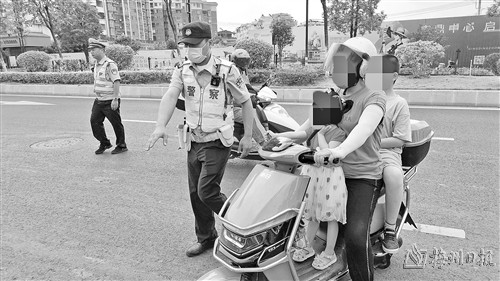 民警在现场执勤时,发现一女子驾驶电动车从掉头路口逆向驶来,前、后座各载有1名儿童,而且他们均未佩戴头盔,安全隐患大。“我家就住在对面,从这个路口过去会快一些。”该电动车驾驶员被民警拦下后解释道,如果正常行驶,需要在路口等待较长的信号灯,为了少走几百米,干脆“抄近道”。民警对该名驾驶人的违法行为进行严肃的批评教育,并要求其立即改正,并把两名孩子安全带回家。