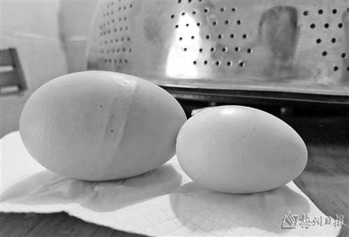 当天上午,记者驱车来到梅城三角镇湾下侯屋。张姨热情地把记者领进门,让我看她放在桌上这枚鸡蛋。乍一看,这枚鸡蛋给人感觉只是比普通鸡蛋稍大一点,不过,张姨拿来了其他普通鸡蛋进行对比,一大一小很直观就显示出了差别(如右图,梁志航摄)。“我家有8只母鸡,都是去年买回来的,圈养在龙眼树下,平时就喂谷和麸皮这些食物,每只母鸡产的蛋都像初生蛋那么小,稍大一点也就40克左右重。”张姨说道,今天她去鸡笼看到了这只蛋特别大,年逾七旬的她也没见过这么大的鸡蛋,这让她觉得很新奇。记者称了一下鸡蛋,发现有100克重,另外量了一下,有8厘米长,是张姨家其它普通鸡蛋的两倍多。“这只蛋,应该是双黄蛋。”张姨说道。