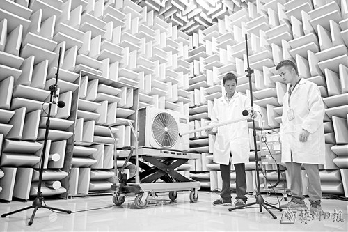 6月2日,技术人员在柳江区一家空调企业的实验室里对即将上市的产品开展噪音测试。