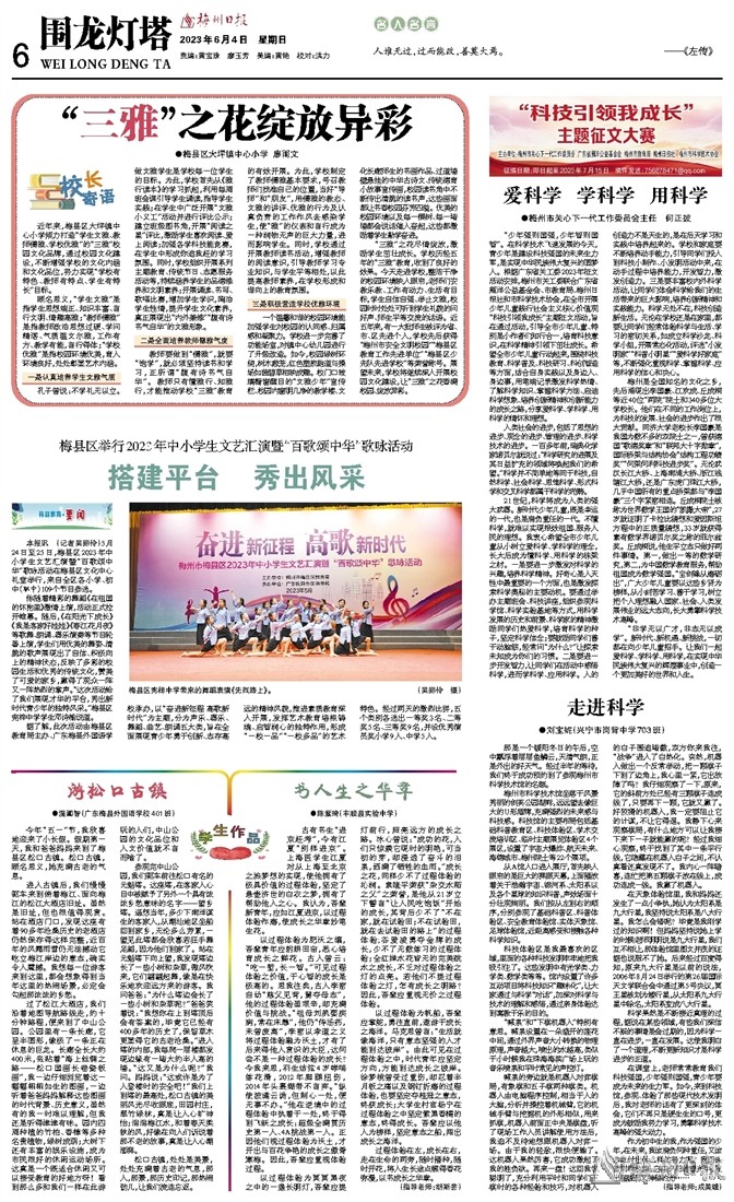 “少年强则国强,少年智则国智”。在科学技术飞速发展的今天,青少年是建设科技强国的未来生力军,是实现中华民族伟大复兴的圆梦人。根据广东省关工委2023年征文活动安排,梅州市关工委联合广东省雁洋公益基金会、市教育局、梅州日报社和市科学技术协会,在全市开展少年儿童践行社会主义核心价值观“科技引领我成长”主题征文活动,旨在通过活动,引导全市少年儿童、特别是小作者们知行合一,培育科技意识,在科学精神引领下茁壮成长。希望全市少年儿童行动起来,围绕科技教育、科学普及、科技研习、科创智造等方面,结合自身实践以及身边人、身边事,用笔端记录激发科学热情、了解科学知识、掌握科学方法、启迪科学想象、培养创新精神和创新能力的成长之路,分享爱科学、学科学、用科学的情怀和理想。