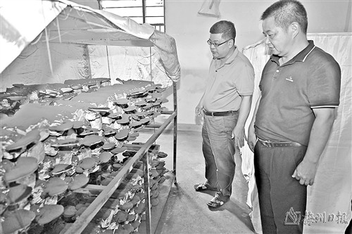 在金田村委会侧,村党支部书记刘淦平每天都会来查看今年种的赤灵芝菌棒,他小心地掀开篷布,只见成片的灵芝菌顶着一朵朵“圆盘”,上面布满褐色粉末。“过段时间就要剪枝了,这个灵芝主要是产灵芝孢子粉。”据刘淦平介绍,在工作队推动下,梅州市农林科学院微生物研究所科技特派员团队与泗水镇党委、工作队签订对接帮扶三方协议,为灵芝种植提供技术支持。去年,金田村成立梅州市鸿帆种植专业合作社,专门种植紫灵芝,刘淦平任合作社理事长。“金田村劳动力缺乏,我们希望灵芝等的种植能进一步提高村集体收入,去年种植收益有1万元。”刘淦平说,今年在去年试种的基础上扩大规模,紫灵芝菌棒有5000棒。不仅如此,金田村今年还试种有五指毛桃、白背草等南药,“起到示范带动的作用,吸引更多村民一起种植。”刘淦平补充道。