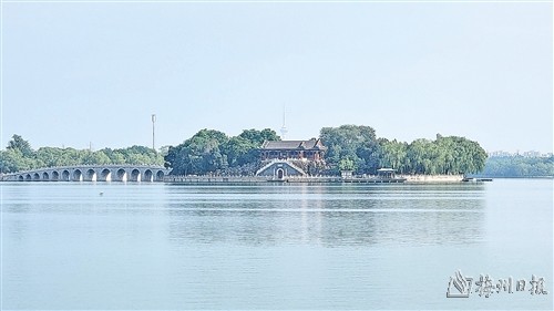 午饭后我们稍做休息,按照行程安排,驱车到了颐和园。导游介绍说,如果我们要游完整个园林,至少要1天的时间,很多当地人就经常带上干粮,在园子里轻松过周末。受时间限制,我们只游览了颐和园的几个主要景点。我们先从颐和园的正大门进入,走过“云岩”牌坊,站在桥上可以看到后湖两岸仿江南水镇而建的买卖街。下了桥就是长廊了,由于慈禧酷爱江南风景,就请画家在每根梁枋上画画,内容包括山水风景、花鸟鱼虫、人物典故、神话传说等,共有14000余幅;画廊的对面是昆明湖,湖面碧水含烟,遥望烟雨朦胧中的十七孔桥,一幅江南美景美不胜收;然后,我们又登上了万寿山。在这一个温柔惬意的午后,我们漫步在红墙画廊里,听一砖一瓦岁月的故事,感受着这悠悠百年历史,心中无限感慨,虽然她经历了世代沧桑变化,但依旧秀美,依旧宏伟!