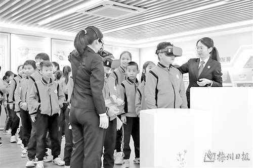 “这个地方好像监狱呀,有什么作用呢?”“现在你看到的是少管所,是对已满14周岁、未满18周岁的少年犯进行教育、挽救、改造的场所。”在法治教育实践基地里,学生们正戴上VR法治教育一体机,以“第一人称视角”体验“进入少管所”“刷单诈骗”等项目,体验过程中不时发出阵阵感叹。