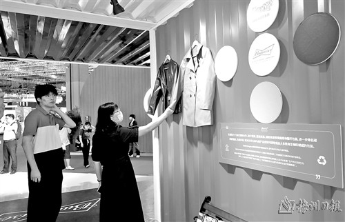 6月11日,参观者在博览会现场用手触摸一件使用废酒糟为原料制作的植物基皮革服装。