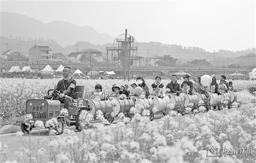 在浙江杭州临安区青山湖街道郎家村“共富稻田”,游客乘坐田野小火车在油菜花地里感受春日美景(4月1日摄)。“共富稻田”定位多功能田园农旅综合体,陆续打造了妙哉花园、稻田观光道、稻田餐厅、稻田茶吧等乡村旅游特色节点,吸引城市居民前来体验户外农田生活。