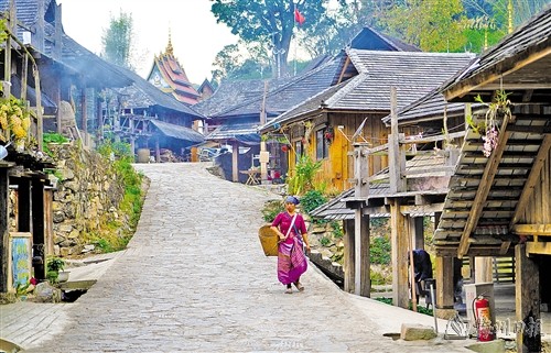 走在村寨入口的主道上,可见两旁的吊脚楼布置有青竹坊、陀螺坊等颇具拉祜民族特色的手工作坊,有些楼内还摆放着从大山深处采摘后晒干的各种菌菇。只见一群小孩在房前屋后欢快地追逐嬉闹,一队壮男哼着小曲在高空架梁铺瓦修缮民房,一排妇女在房前专心致志缝衣做包……一派生机盎然的和谐生活场景。