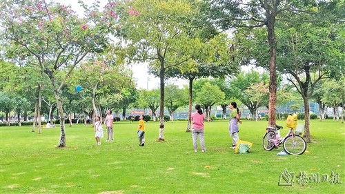 在整个公园里,到处都是茂密树木和青青草坪。夏天到了,橙红的凤凰木、紫荆花、深红的紫薇花、黄色的决明花、浅绿的石栗花、恰似黄色小蝴蝶的蔓花生花、各色的夹竹桃等灿烂开放。花丛中、草坪里、树荫下,市民们有的奏乐、有的唱K、有的挂上吊床纳凉、有的翩翩起舞、有的带娃奔跑,还有对新人在草坪里幸福地拍着婚纱照呢!