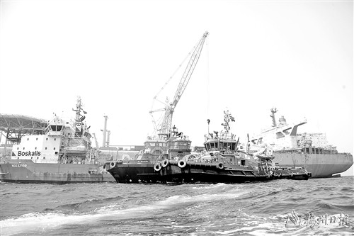 图为6月12日在也门荷台达附近海域拍摄的联合国工程船和“萨菲尔”号油轮。