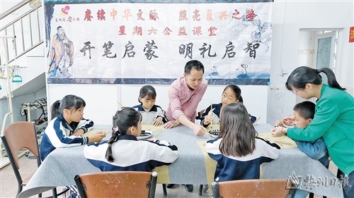 “学书贵有恒,练书须用心。心正则笔正,笔诀记心中。下笔不离点,转折贵圆露……”在“星期六公益课堂”上,孩子们经过“拜师礼”“开天眼”等环节,书法课堂正式开课。公益书法课授课老师邓礼栋耐心细致地对书法起源、发展、执笔手法等进行讲解,并手把手教孩子们进行书法练习。孩子们手持毛笔,从最基本的横竖开始反复练习。邓礼栋告诉记者,书法课从基础教起,每周授课4小时,课后学生将当日所学写在宣纸上,再由老师点评指导。
