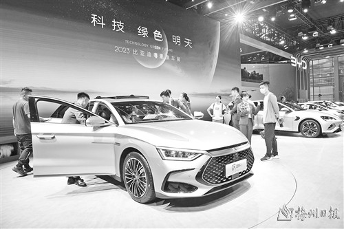 6月16日,观众在粤港澳大湾区车展比亚迪展台了解新能源汽车。