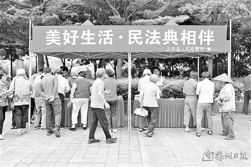 本报讯 结合我国第三个“民法典宣传月”,为深入推动民法典的贯彻实施,大力宣传民事检察职能,县检察院日前在县城长乐公园开展“美好生活·民法典相伴”主题宣传活动,组织检察干警走上街头,向广大群众宣传民法典,让民法典“走”到群众身边、“走”进群众心里。