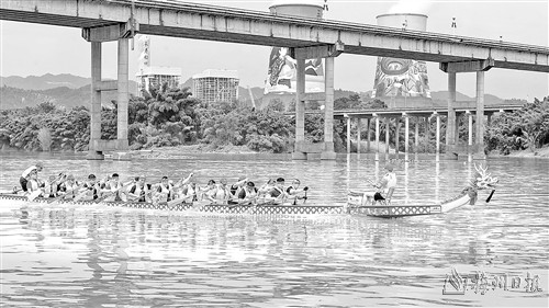 大埔三河坝,选手们为端午节的龙舟比赛紧锣密鼓地训练中。(张宇霞 摄)