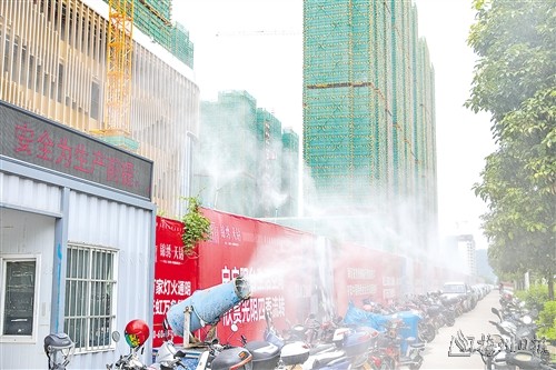在梅州天虹购物中心的建筑施工现场,随着雾炮、高压龙头等除尘设备的打开,水雾很快覆盖了工地现场。“在工地围蔽范围内,我们安装了200多个雾炮和高压龙头,每天开4次。”现场安全负责人匡燎炼介绍说,为了做好扬尘污染防治工作,施工方严格落实项目现场扬尘管控责任和“六个百分百”要求(工地周边100%围挡,裸露场地100%覆盖,场地主要道路100%硬化,出入车辆100%冲洗,拆迁工地100%湿法作业,渣土车辆100%密闭出场)。