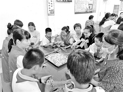 随后的端午节传统文化知识抢答环节,将活动推向高潮。问题围绕端午节的由来、历史、文化习俗等方面设置,学生们积极参与抢答,现场气氛十分活跃。通过问答环节,进一步加深了学生对传统节日文化内涵的理解。在亲子包粽子比赛中,学生在家长的指导下,兴奋地学着包粽子的手法。一双双忙碌的小手穿梭在一片片翠绿的粽叶间,现场气氛其乐融融(如图,受访者提供)。最终,评委评选出10个优秀作品并颁发了礼品。